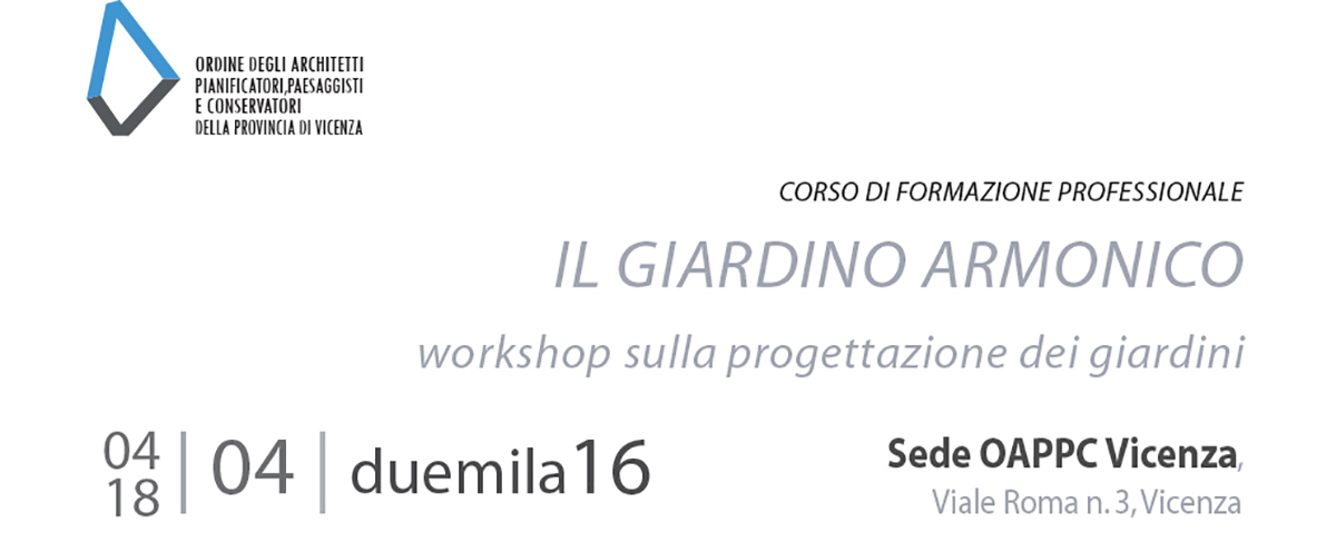 L’Ordine degli Architetti della Provincia di Vicenza, con il contributo incondizionato di Eterno Ivica, organizzano un corso di formazione professionale su "Il Giardino Armonico: workshop sulla progettazione dei giardini". L'evento si terrà in due giornate Lunedì 4 e Lunedì 18 Aprile 2016 dalle ore 9.00 alle ore 18.00 presso la sede OAPPC Vicenza - Viale Roma n° 3, Vicenza.